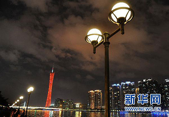 位于珠江边的广州塔在夜色中璀璨夺目(3月6日摄)。卢汉欣 摄