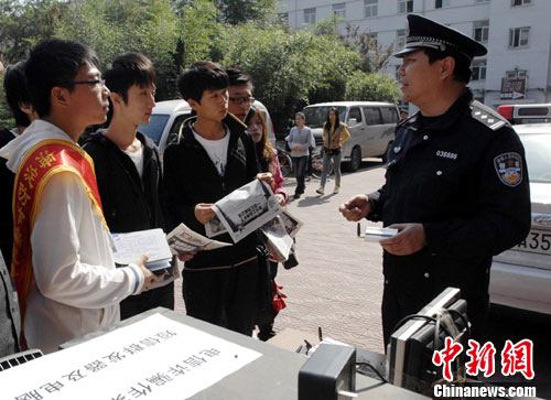 9月29日,十名来自中国人民大学的学生正在向校友们发放北京海淀警方制作的防范电信诈骗宣传品。他们是海淀区刚刚成立的千名防范诈骗宣传志愿者中的成员。据海淀警方介绍,为近一步加大对电信诈骗的防范宣传力度,警方在辖区街乡政府、银行及高校的大力支持下,组建了上千名防诈骗宣传志愿者队伍并开展了培训,此举在本市还属首次。警方表示,将通过这些志愿者深入社区、学校、银行、写字楼等地开展防范电信诈骗宣传,以有效减少电信诈骗的发生。