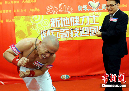 为迎接国庆61周年,香港一商场特别请来大世界吉尼斯纪录的中国“倒立王”李鑫于国庆期间进行倒立绝活表演。29日,李鑫在记者会上表演钢筋锁喉。中新社发 谭达明 摄