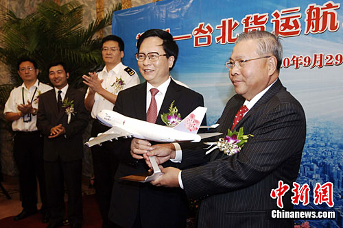9月29日下午,台湾中华航空董事长魏幸雄向福建省副省长、福州市长苏增添赠送首航货运飞机模型。当日,福州至台北货运航班首航仪式在福州长乐国际机场举行。福州至台北货运航线由台湾中华航空股份有限公司运营,每周三、六往返福州长乐国际机场和台北桃园机场。中新社记者 王东明 摄