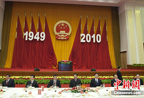 9月29日,全国政协办公厅、中共中央统战部、国务院侨办、国务院港澳办和国务院台办在北京人民大会堂联合举行国庆招待会,中共中央政治局常委、全国政协主席贾庆林,中共中央政治局常委、国家副主席习近平,中共中央政治局常委、国务院副总理李克强,与来自海内外的新老朋友欢聚一堂,共同庆祝中华人民共和国成立六十一周年。中新社记者 盛佳鹏 摄