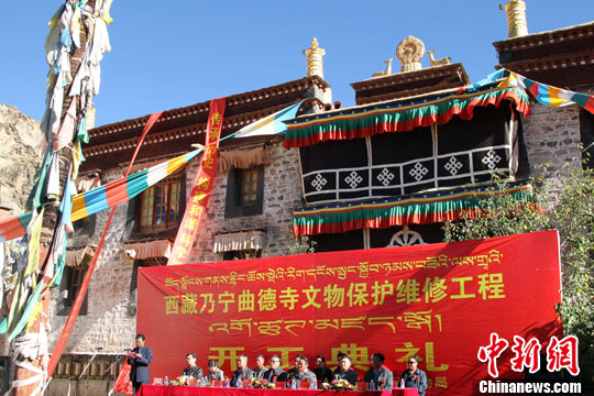 西藏江孜县乃宁曲德寺(简称乃宁寺,又称南尼寺)29日举行乃宁寺文物保护维修工程开工典礼。中新社发 徐长安 摄