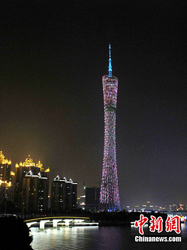 新广州电视塔9月30日晚正式亮灯为广州夜景添璀灿,广州新电视塔是目前世界上最节能环保的高层绿色建筑之一,新电视塔安装了雨水回收利用系统、风力发电系统、太阳能光电幕墙和LED节能灯具应用等多项节能环保技术。罗仰明 摄