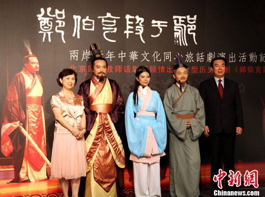 大陆名校北京四中及顺义分校近百名中学生以“中华传统文化”为主题来台开展“两岸青少年文化同心旅”活动,将与台湾北一女中等台湾名校师生联谊交流。图为北一女中校长张碧娟(左一)与四中校长刘长铭(右一)与《郑伯克段于鄢》教师演员在今天的新闻发布会上合影。中新社发 陈立