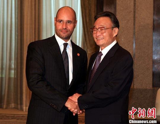 10月1日,全国人大常委会委员长吴邦国在上海西郊宾馆会见利比亚国际慈善与发展机构主席赛义夫·伊斯兰·卡扎菲。中新社记者 潘索菲 摄
