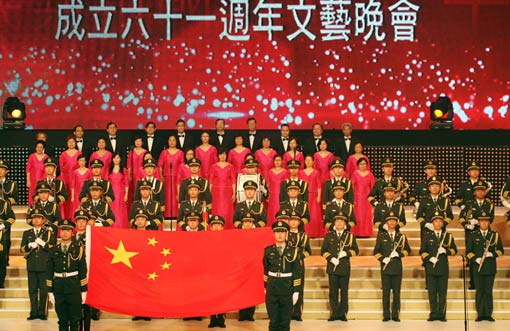 10月1日, 香港同胞庆祝中华人民共和国成立61周年筹备委员会在香港体育馆举行文艺晚会。当天,香港特区政府举行连串庆祝活动,主要包括升旗仪式及国庆酒会,文艺晚会及烟花汇演等。中新社发 洪少葵 摄