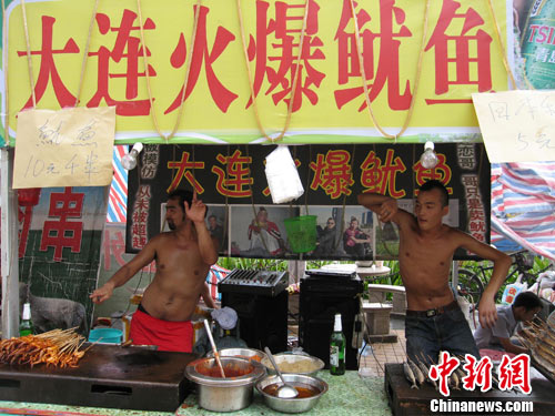 10月1日,广西南宁香蕉旅游美食节上,两名烧烤摊主一边工作一边展示曼妙舞姿,吸引食客眼球。中新社记者 王刚 摄