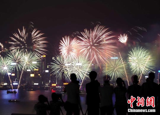 10月1日晚,香港庆祝中华人民共和国建国61周年举行烟花汇演。9时在维港两岸绽放23,800多枚烟花,历时23分。9幕烟花主题配合不同背景音乐,尽显东方之珠魅力。 中新社发 洪少葵 摄