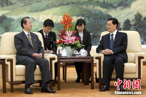 10月2日,中共中央总书记、国家主席胡锦涛在北京会见了由中央政治局委员、书记局书记崔泰福率领的朝鲜劳动党高级代表团。中新社记者 盛佳鹏 摄