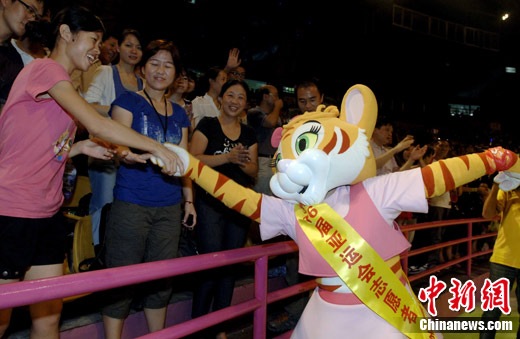 国庆黄金周期间,广州长隆大马戏表演场充满亚运激情。近万名观众在亚运动漫人物志愿者——卡卡虎的带领下,齐跳亚运助威操,为亚运加油。中新社发 刘卫勇 摄
