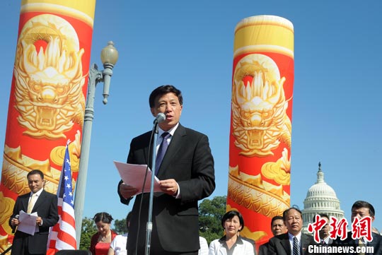 10月2日,美国首都华盛顿标志性景观国会山成了中国文化大戏的背景舞台,一年一度的华盛顿“中国文化节”在这里举行。图为当日中国驻美大使张业遂在文化节日上致辞。中新社发 吴庆才 摄