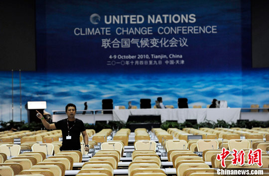 联合国气候谈判会议将于10月4日至9日在天津举行。图为10月3日下午,工作人员在开幕式现场做最后的准备。中新社发 刘震 摄