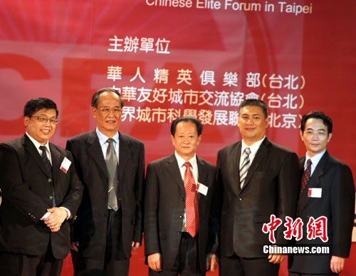 10月3日,由台北华人精英俱乐部、中华友好城市交流协会、北京世界城市科学发展联盟共同主办的2010“第九届华人精英论坛”在台北圆山饭店举行。图为北京世界城市科学发展联盟执行主席董彦璋(左三)、北京世界新经济研究院院长陈瑜(左二)出席论坛。 陈立宇 摄