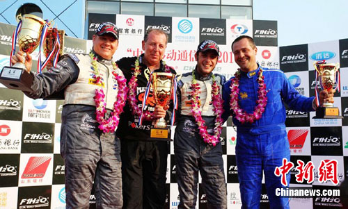 图为获得2010F1摩托艇世界锦标赛中国临沂大奖赛的选手在领奖台上。中新社发 周秀光 摄