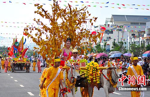 图为10月4日,中缅佳丽乘坐独具特色的牛花车参加巡游。中新社发 刘洪 摄