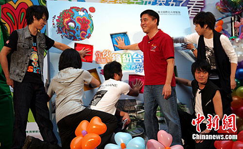 人气摇滚乐组合五月天,10月4日宣布出任2010台北国际花卉博览会的“缤纷花博亲善大使”。图为当天于台北举行的相关发布活动中,五月天成员与台北市长郝龙斌共同完成手印签名仪式。王健 摄