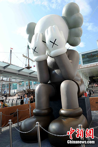 香港海港城邀请国际知名的美国艺术家KAWS合作,于10月4日至24日在海港城广场举办名为《KAWS:PASSINGTHROUGH.跨展览》,展出一批潮流玩物及巨型卡通人物COMPANION雕塑。图为高5米的巨型KAWS公仔,它戴着交叉手套遮掩其面,再以沉思着的坐姿展现于大家面前。中新社发 谭达明 摄