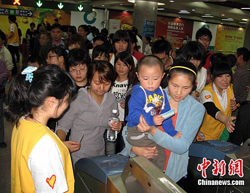 国庆期间,北京地铁又迎来了客流高峰。来自北京团市委志愿者联合会团体会员的北京政法职业学院的志愿者从十月一日开始,每天数十人在天安门以及王府井等人流集中的地铁站协助地铁工作人员疏导乘客,确保良好的乘车秩序。