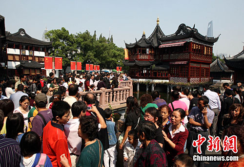 10月5日,上海城隍庙游人如织。受到世博效应的影响,原本就受各地游客青睐的“上海游”今年更是行情看涨。据统计,上海今年的“十一”黄金周预计将迎来800万游客。中新社记者 汤彦俊 摄