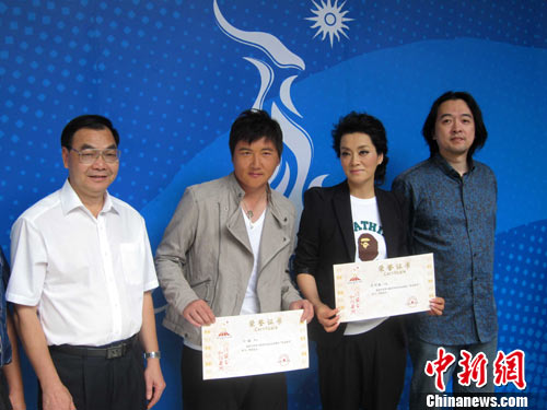 10月7日下午,广州亚组委向孙楠毛阿敏颁发证书,聘任其担任亚运会歌歌手。 中新社记者 柯小军 摄