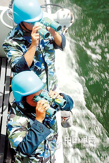 8月下旬至9月下旬,南海舰队某大队组织国产某新型扫雷艇奔赴某海岛驻训,创下连续48小时海上实扫水雷纪录。图为大队官兵在扫雷过程中监视海情。朱国军 摄
