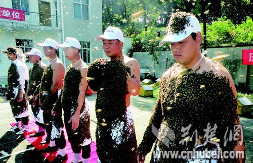 近日,“蜂人大赛”在(湖北省襄樊市)华夏蜜蜂博物馆开赛,10名“勇士”头部及身上都爬满成千上万只蜜蜂,让观众啧啧称奇。