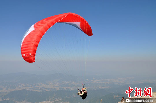 拉伞、助跑、冲刺、腾空,一个个“鸟人”相继从万丈绝壁跃入蓝天……国庆期间,54名来自中国内地7省市以及香港、台湾、韩国的男女滑翔伞飞行员在湖南平江县幕阜山顶为4万多名观众奉献了一场精彩的“鸟人”空中盛会。中新社发 黄振 摄