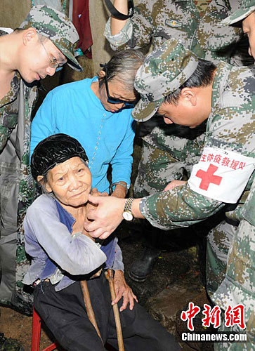 部队医护人员为受灾群众诊治病情。朱文 摄