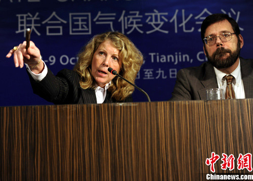 10月9日,为期6天的联合国气候变化会议在天津闭幕。图为美国谈判代表团团长乔纳森·潘兴(右一)在发布会现场。中新社记者 刘震 摄