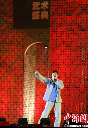 10月9日晚,2010中国沧州国际武术节在河北隆重开幕,成龙、陈国坤、毛阿敏等演艺界明星相继亮相,为武术节增添一道靓丽的风景。图为成龙开幕式献歌,引爆现场。