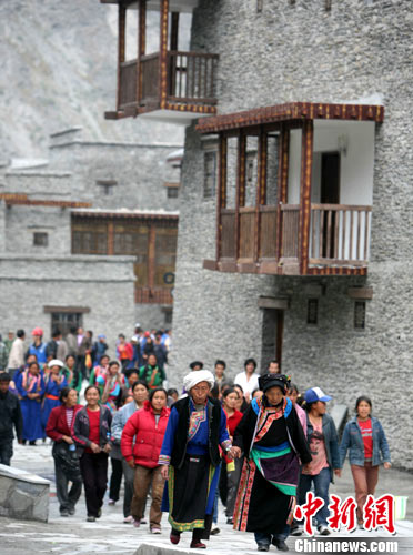 10月9日,参加对口援建移交的22名湖南省政府代表团抵川。四川阿坝藏族羌族自治州理县在“5.12”汶川特大地震中受灾严重,经过湖南省援建者两年多的艰苦努力对口援建项目全部竣工明日即将交付使用。图为四川理县桃坪羌寨民众正在参观新羌寨。