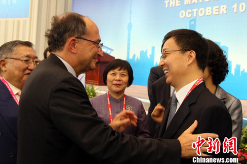 10月10日,上海市长韩正(右)与前来出席市长咨询会的巴黎索邦大学经济学教授克里斯蒂安亲切交谈。当日,上海市市长国际企业家咨询会议第二十二次会议在上海世博园世博中心开幕,来自世界各国的市长和500强企业家出席本次会议,围绕着“建设充满活力的创新城市”的大会主题,为世博会后上海的城市和经济发展出谋划策。