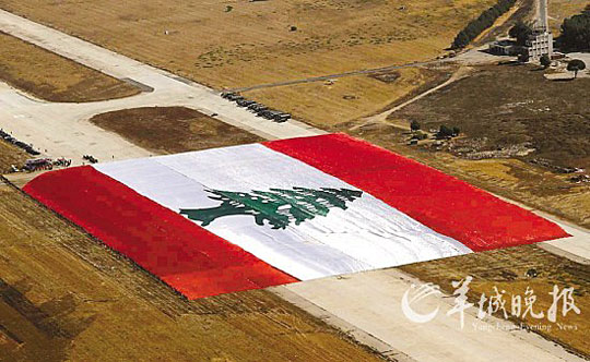 黎巴嫩10日公布从东部一座空军基地上空航拍的一面巨型国旗的照片(上图),试图打破最大国旗世界纪录。这幅国旗展开面积为6.5万平方米,国旗正中绿色雪松图案面积为10452平方米,这一数字恰好与以平方公里为单位的黎巴嫩国土面积数字相同。现有最大国旗纪录保持者是摩洛哥,国旗面积是6万平方米。