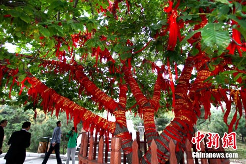 10月11日,一些游人在山东新泰莲花山景区休闲观光,这棵系满祝福红布条的板栗树是当地自然人文的一大景观,吸引不少游客驻足留影。 中新社记者 宋吉河 摄