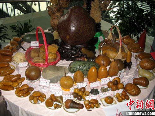 10月12日,第六届柳州国际奇石节在广西柳州开幕,来自中国、美国、马来西亚、新加坡、韩国等11个国家和港、澳、台地区的1500多件奇石精品汇集。图为满桌形态各异的水果奇石大餐令参观者大饱眼福。