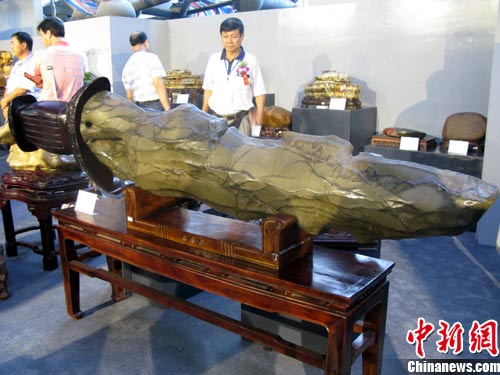 10月12日,第六届柳州国际奇石节在广西柳州开幕,来自中国、美国、马来西亚、新加坡、韩国等11个国家和港、澳、台地区的1500多件奇石精品汇集,令参观者大饱眼福。图为外形极像宝剑的奇石令参观者叹为观止。