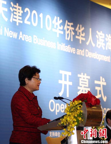 10月12日,中国·天津2010华侨华人滨海新区创业发展洽谈会在天津滨海新区举行。来自美、日、加、澳等22个国家和地区的350余位侨商组织代表,携150余个投资意向与会。图为中国国务院侨办主任李海峰出席开幕式并致辞。 中新社发 田齐 摄