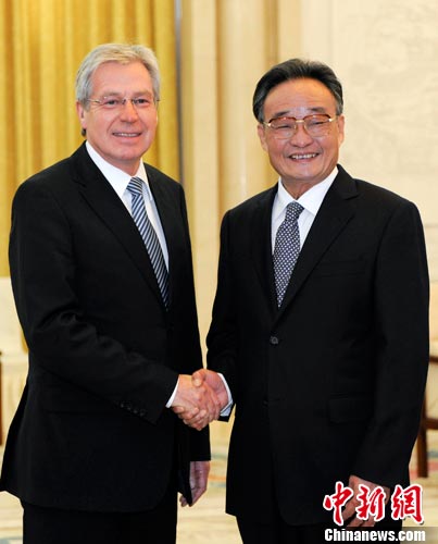 10月12日,中国全国人大常委会委员长吴邦国在北京人民大会堂会见了德国联邦参议院议长伯恩森。 中新社发 廖攀 摄