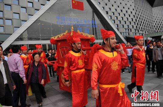 10月12日,一坛由浙江绍兴黄酒集团为2010上海世博会量身定做,将永久珍藏于世博中国馆的“古越龙山世博永久珍藏酒”由花轿抬着进入中国馆。中新社发 袁云 摄