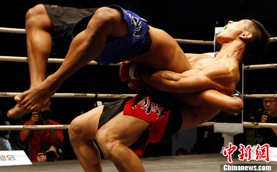 10月9日晚,由马来西亚IPC国际集团和中国国际文化传播中心以及英雄传说赛事机构联手主办的“英雄传说-决战云顶”世界搏击王者争霸赛暨中泰拳王争霸战在马来西亚吉隆坡云顶举行。图为“英雄传说-决战云顶”世界搏击王者争霸赛参赛拳手对决。中新社发 钱兴强 摄