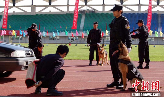 10月12日,北京朝阳警方举行轮值轮训队汇报表演暨社会面控制快速处突小分队启动仪式,轮值轮训队民警和警犬队分别进行了可疑车辆拦截、盘查、追捕、控制和警犬扑咬等综合演练科目的表演。 中新社发 徐铮 摄