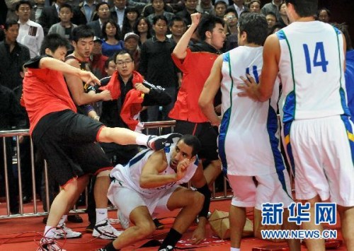 10月12日,中国男篮在许昌同来访的巴西队进行第三场热身赛,令人意外的是,双方球员竟然在场上爆发了群殴。巴西队球员随后集体退场。 王颂摄 图片来源:新华网