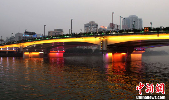 广州亚运开幕在即,广州迎亚运珠江两岸光亮工程已显规模,珠江两岸光亮工程西起白鹅潭,东至琶洲大桥,南北总长度18公里。图为广州人民桥在五彩灯光照射下流光溢彩。中新社发 罗仰明 摄