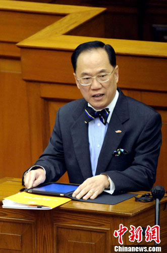 香港特区行政长官曾荫权14日到立法会出席答问大会,回答议员就施政报告提出的质询。 中新社发 谭达明 摄