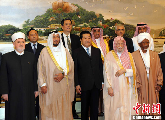 10月14日,中共中央政治局常委、全国政协主席贾庆林在北京人民大会堂会见了以阿卜杜拉·图尔基为团长的伊斯兰世界联盟代表团一行。 中新社发 张勤 摄