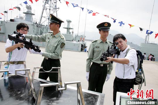 10月16日,中国人民解放军驻港部队与香港各高校学生在昂船洲军营举办“2010年度驻港部队与大学生互访联谊活动”,来自12所大专院校的400余名师生兴致勃勃体验军旅生活,参观军舰、武器装备。 中新社发 洪少葵 摄