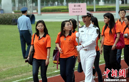 10月16日,中国人民解放军驻港部队与香港各高校学生在昂船洲军营举办“2010年度驻港部队与大学生互访联谊活动”,来自12所大专院校的400余名师生兴致勃勃体验军旅生活,参观军舰、武器装备。 中新社发 洪少葵 摄