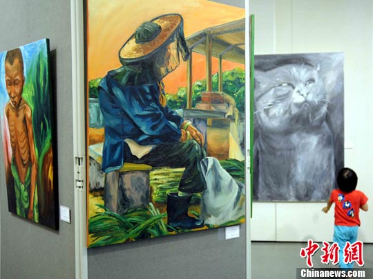 16日,展品吸引小童的目光。香港中文大学专业进修学院“第七届西方艺术高等文凭课程”的21位学员,于14日至18日在中央图书馆举办“画+画架”之源笔展。展品涵盖不同主题,表达了学员对不同社会议题的看法及对生活的态度。 中新社发 谭达明 摄