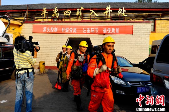 10月16日早晨6点左右,河南平煤集团平禹四矿发生瓦斯突出事故,采面风巷瓦斯浓度超过40%。图为当日16点升井面色凝重的抢险人员。中新社发 关涛 摄