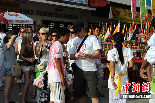 10月16日,来自美国的游客在泰国普吉岛参加2553年佛历斋节盛典。历时九天的斋节,于当日午夜收官。中新社记者 郑祚声 摄